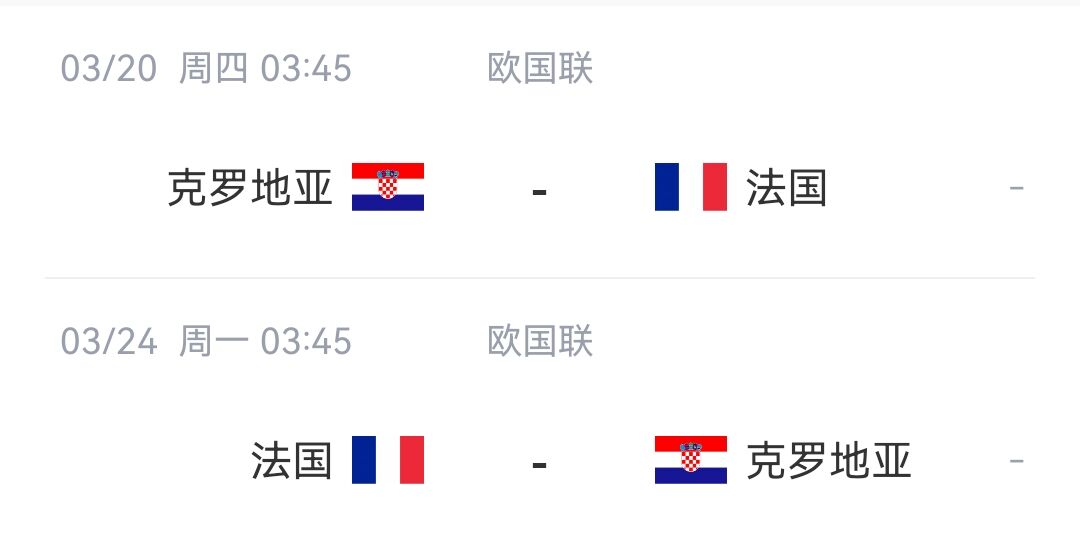 此前的歐國聯(lián)小組,法國隊力壓意大利、比利時和以色列以小組第一晉級淘汰賽,在1/4決賽中,他們要面對的是克羅地亞隊。法國與克羅地亞將在北京時間3月20日和3月24日凌晨進行兩回合主客場的交鋒。