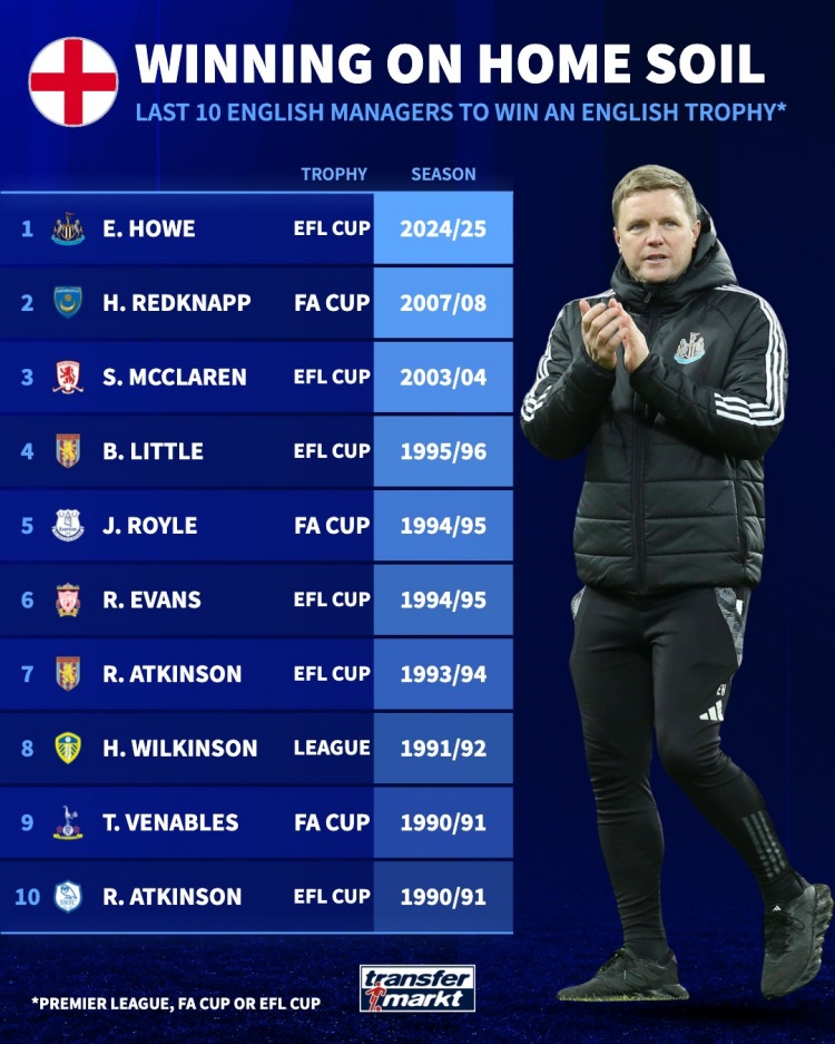 紐卡主帥埃迪-豪成為07-08賽季之后首位贏得國內(nèi)賽事冠軍的英格蘭主帥,上位做到這點的是哈里-雷德克納普。