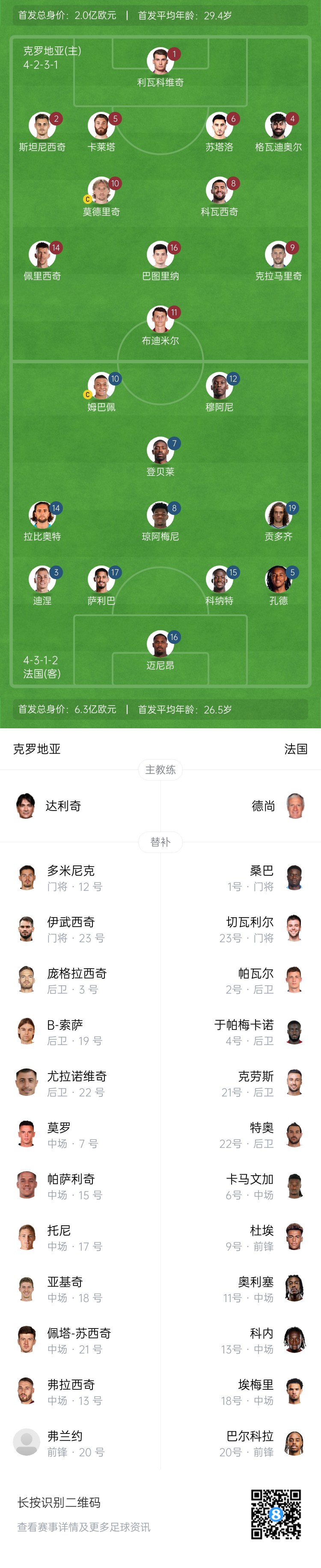 3月21日訊 北京時間03:45,歐國聯1/4賽決賽首回合,克羅地亞坐鎮(zhèn)主場迎戰(zhàn)法國。賽前官方公布了雙方的首發(fā)名單。