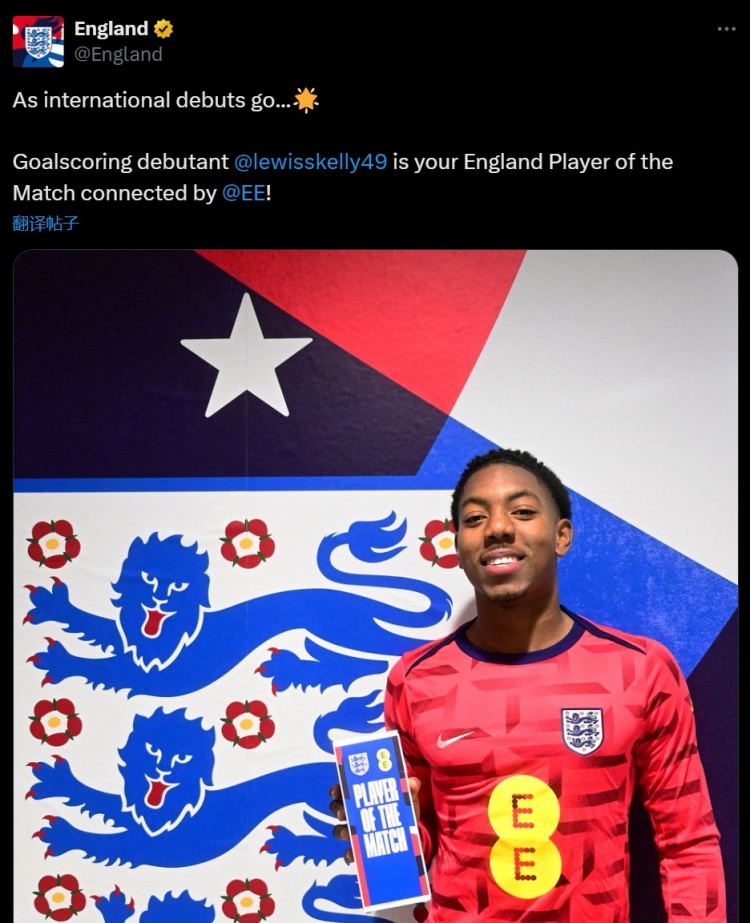 2025-03-22 08:00:26處子秀首開記錄!英格蘭隊官方:斯凱利當選球迷票選全場最佳