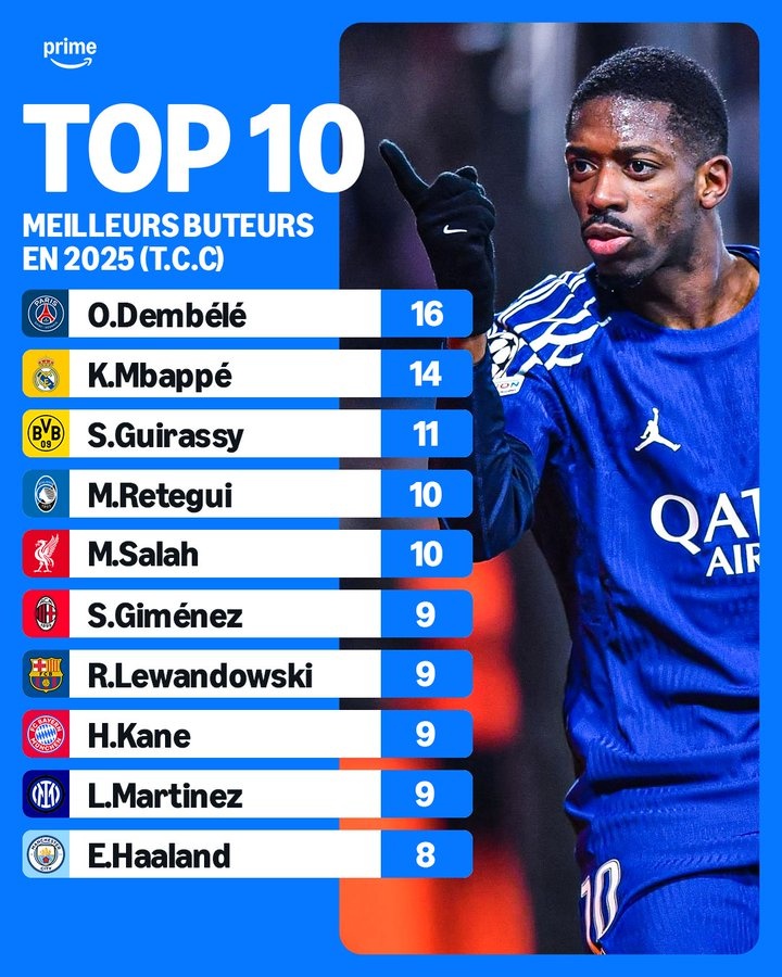 2025-02-24 20:00:272025年五大聯賽射手榜:登貝萊16球領跑,姆巴佩14球第二