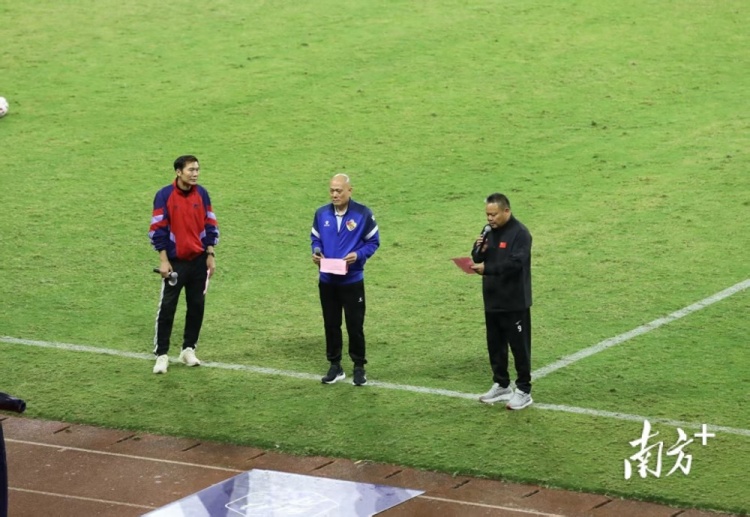 梅州客家主場對陣河南隊的比賽上半場,梅州客家以2-0的比分領(lǐng)先。中場休息時,來自梅州的三位足球名宿王惠良、池明華、謝育新出現(xiàn)在賽場上,用真摯樸實的話語為梅州客家加油。