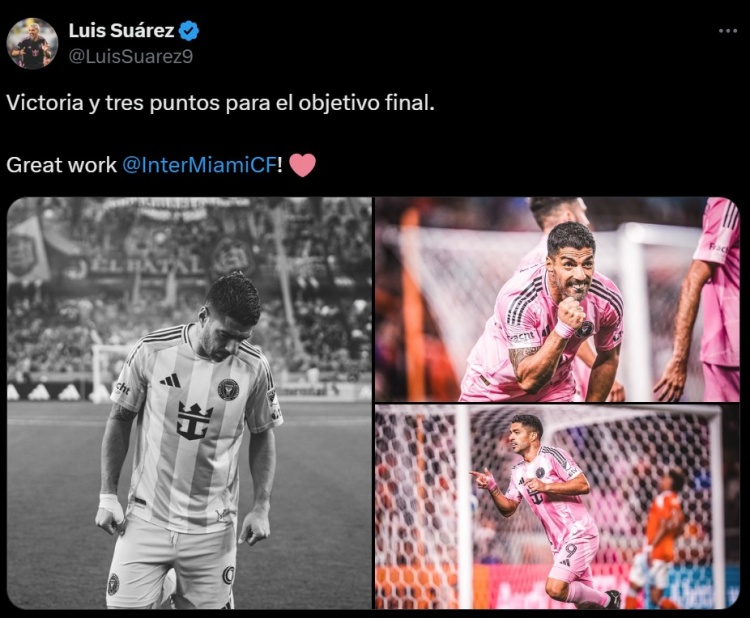 蘇亞雷斯也在賽后通過(guò)社媒曬出自己的慶祝照,并配文:“勝利與通向最終目標(biāo)的關(guān)鍵3分。全隊(duì)的表現(xiàn)很棒@邁阿密?chē)?guó)際俱樂(lè)部。”